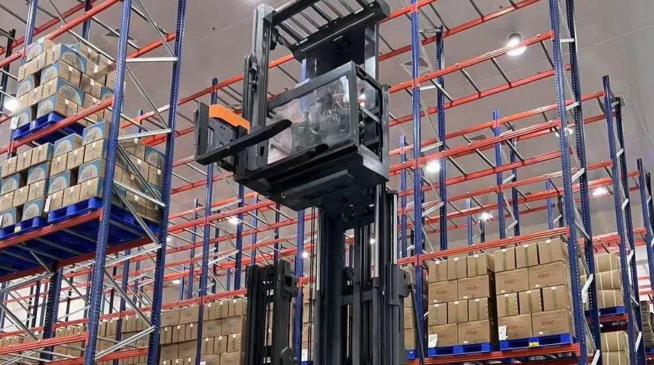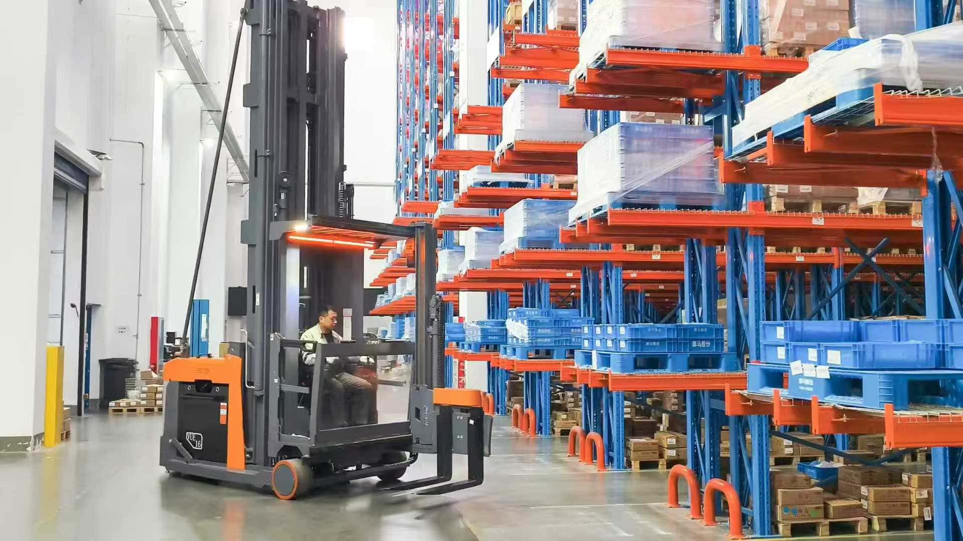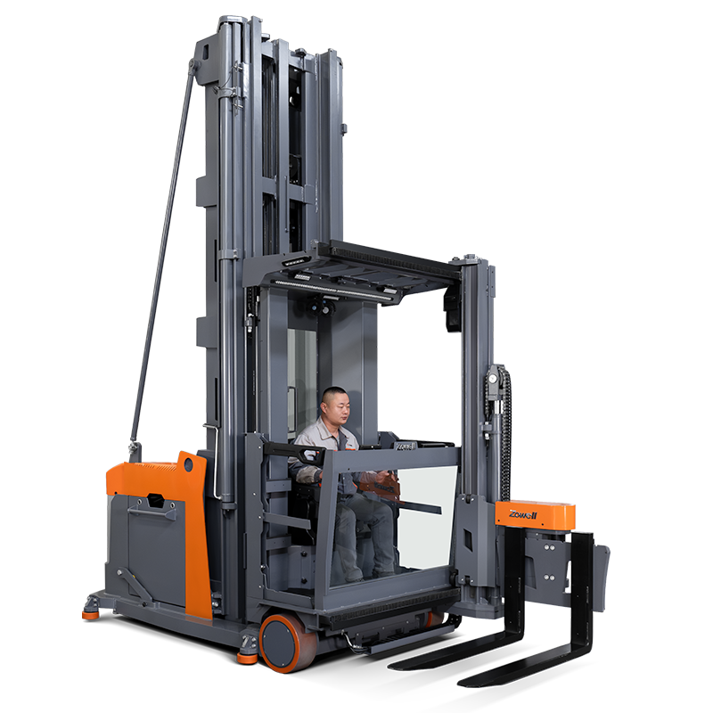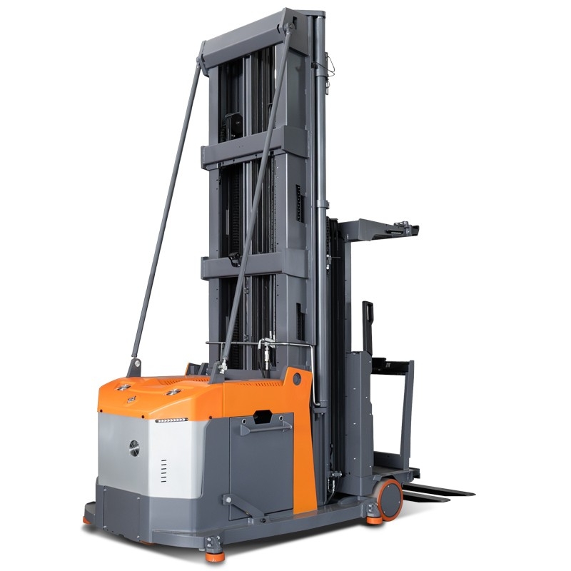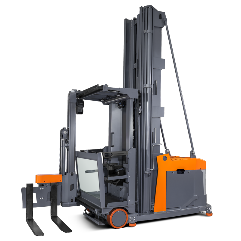 A empilhadeira VUE de três vias é uma empilhadeira para corredores estreitos que combina funções de empilhamento e picking. Sua alta capacidade de carga garante a estabilidade e a segurança do veículo durante trabalhos em altura.
