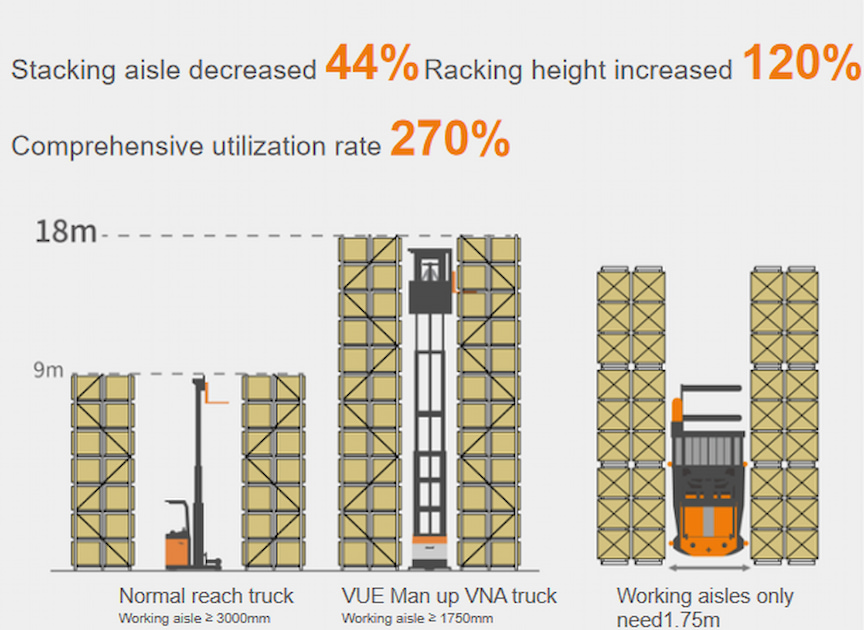A nova geração do VUE possui uma impressionante altura máxima de elevação de 18 m e uma capacidade máxima de carga de 1.600 kg. Sua largura de corredor ultra estreita de 1,75 m aumenta significativamente a utilização do espaço do armazém, tornando-o ainda mais valioso.