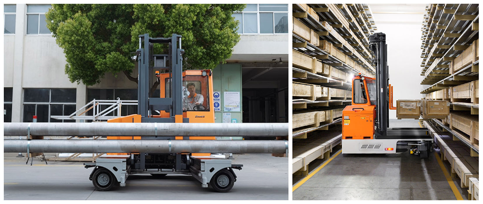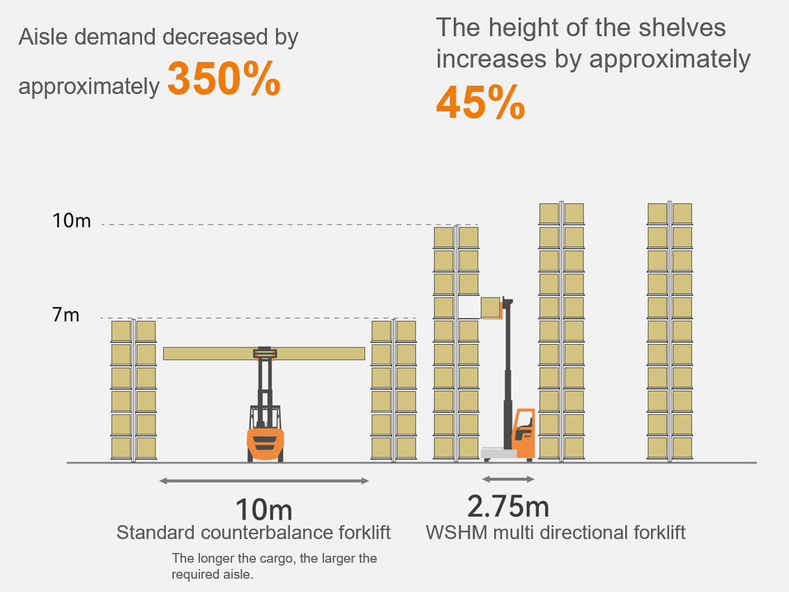 A empilhadeira elétrica multidirecional da série WSHM da Zowel foi projetada para movimentar mercadorias pesadas, volumosas e muito compridas em corredores estreitos.