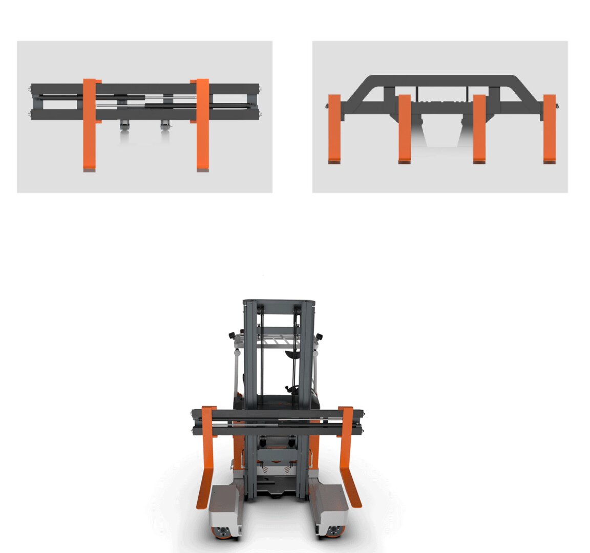 Modo de deslocamento lateral: Ideal para movimentação de materiais longos, permitindo operação em corredores com largura de até 2300 mm, mesmo com cargas de 3 toneladas.
